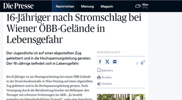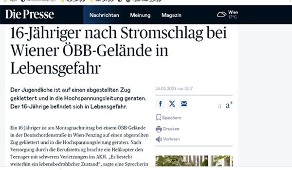 نجا شاب يبلغ من العمر 16 عامًا بأعجوبة من الموت، بعد تعرضه لصعقة كهربائية على متن قطار متوقف في محطة شارع دويتشاوردن في فيينا-بينزينج، مساء أمس الاثنين.