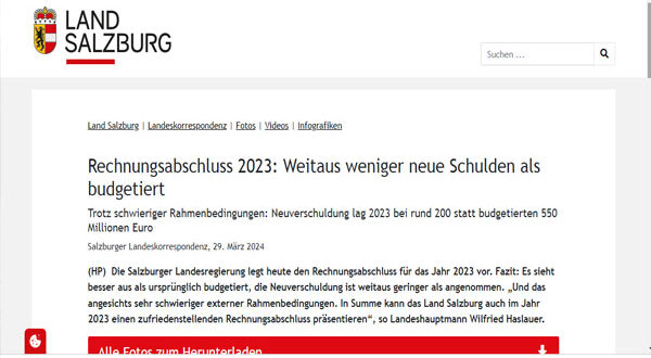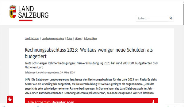 أظهرت البيانات المالية الصادرة يوم الجمعة، أن ولاية سالزبورغ عادت إلى الاقتراض في عام 2023 لأول مرة منذ سنوات، مع عجز بلغ 200 مليون يورو فقط، بينما كانت التوقعات تشير إلى 550 مليون يورو.