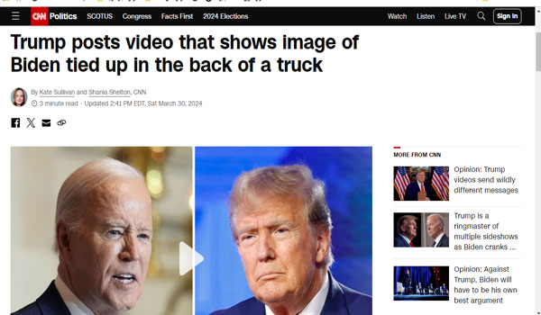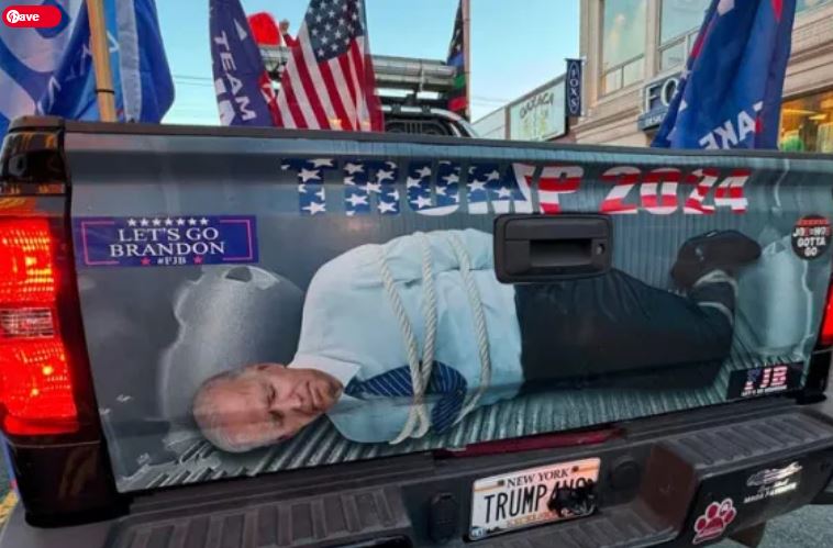 يتضمن الفيديو الذي نُشر الجمعة لقطات لشاحنتين صغيرتين تحملان لافتات مؤيدة لترامب، تسيران على طريق سريع، وعلى الباب الخلفي للشاحنة الثانية عُلقت صورة لبايدن مكبل اليدين كما لو كان مخطوفاً وملقى في مؤخرة الشاحنة.