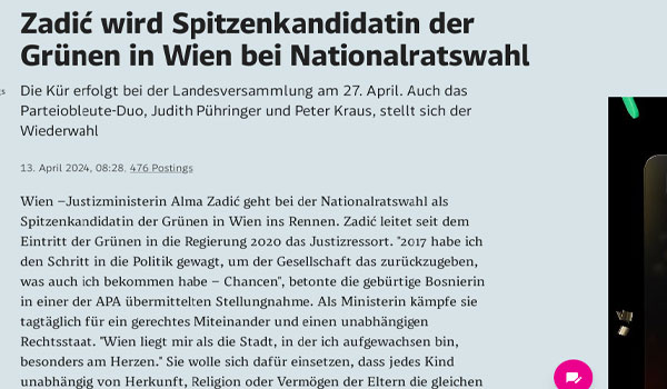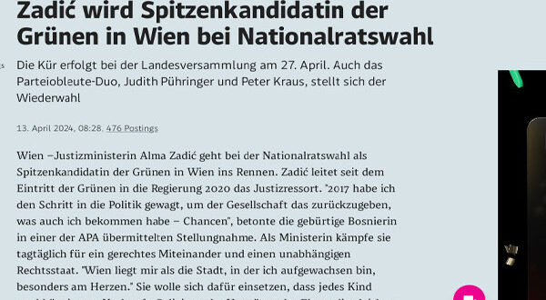 وأضاف حزب الخضر في بيان: “يسعدنا أن وزيرة العدل ألما زاديتش ستترشح للمجلس الوطني على رأس قائمة ولاية فيينا، نحن نتطلع إلى حملة انتخابية ناجحة مع زاديتش والمتحدث الرسمي باسم الحزب ونائب المستشار والمرشح الأول فيرنر كوغلر”.