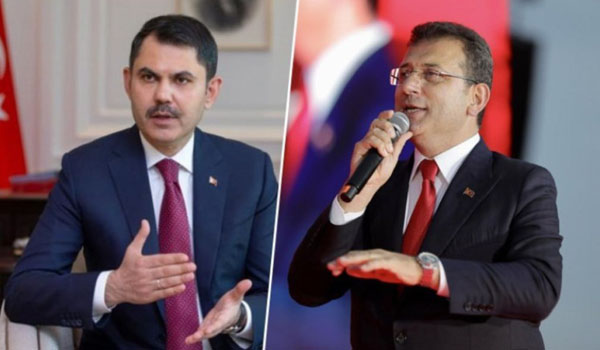 من اليمين مرشح حزب الشعب الجمهوري لبلدية اسطنبول الكبرى أكرم إمام أغلو، مرشح العدالة والتنمية مراد كوروم
