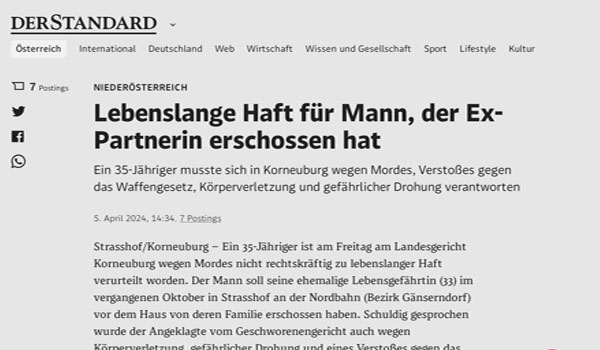 حكمت محكمة كورنيوبورج الإقليمية، يوم الجمعة، بالسجن مدى الحياة على رجل يبلغ من العمر 35 عامًا، لقتله شريكته السابقة، في شارع هوف ان دير نوردبان في فيينا، في أكتوبر الماضي.