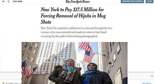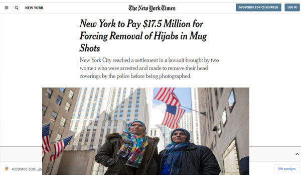 وافقت مدينة نيويورك على دفع مبلغ 17.5 مليون دولار لتسوية دعوى قضائية رفعتها سيدتان مسلمتان، قالتا إن الشرطة انتهكت حقوقهما بعد اعتقالهما، بإجبارهما على خلع حجابيهما قبل تصويرهما.