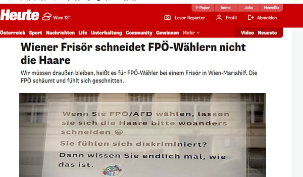 أثار صالون تصفيف الشعر، في شارع لايمجغوبن بفيينا، جدلًا واسعًا، بعد رفضه خدمة العملاء الذين يصوتون لصالح حزب الحرية النمساوي (FPÖ) أو حزب البديل من أجل ألمانيا (AFD).