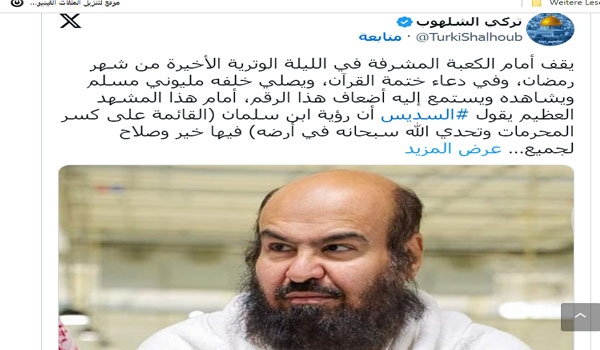 وعلق الناشط السعودي تركي الشلهوب بقوله مستنكرا:”يقف أمام الكعبة المشرفة في الليلة الوترية الأخيرة من شهر رمضان، وفي دعاء ختمة القرآن، ويصلي خلفه مليوني مسلم ويشاهده ويستمع إليه أضعاف هذا الرقم، أمام هذا المشهد العظيم يقول السديس أن رؤية ابن سلمان (القائمة على كسر المحرمات وتحدي الله سبحانه في أرضه) فيها خير وصلاح لجميع المسلمين.”