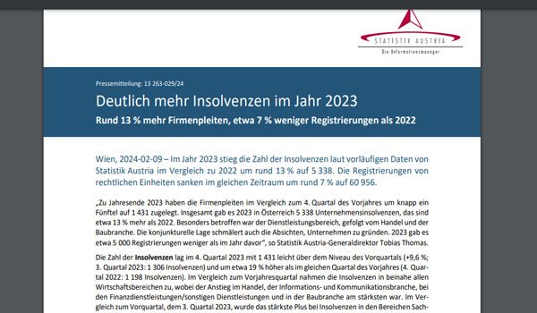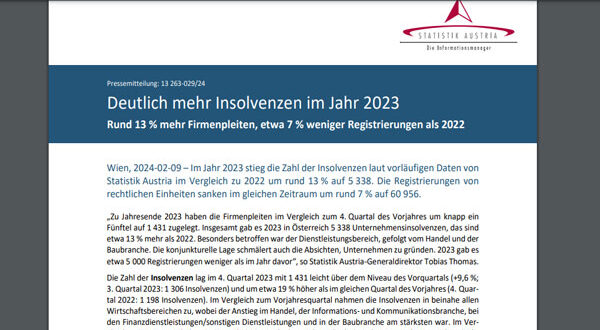 شهدت النمسا، منذ بداية العام، ارتفاعًا مقلقًا في حالات إفلاس الشركات، حيث وصل عدد الشركات التي أعلنت إفلاسها في فورارلبرغ وحدها إلى 45 شركة، وهو الرقم الأعلى منذ عام 2015.