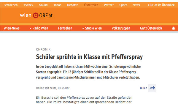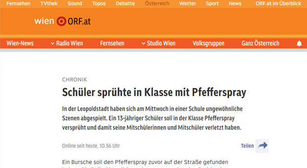 شهدت مدرسة، في حي ليوبولدشتات في فيينا، اليوم الأربعاء، حالة من الفوضى بعد أن رش تلميذ رذاذ الفلفل على زملائه، مما أدى إلى نقل 7 تلاميذ إلى المستشفى.