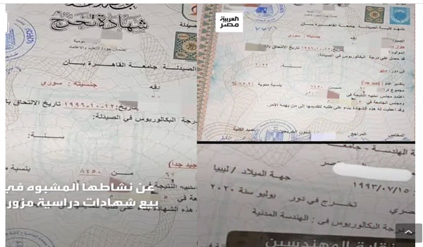 بات بيع الشهادات الجامعية المزورة بمختلف درجاتها ظاهرة منتشرة في مصر في ظل تراخي الإجراءات القانونية والرقابة الحكومية، ودأبت بعض مكاتب السمسرة في عدد من المدن المصرية على إصدار شهادات مزورة، وتحول الأمر إلى مجال تكسب وارتزاق من قبل بعض ضعاف النفوس فيما تبدو الحكومة المصرية كما يقول المثل”أذن من طين وأذن من عجين”.