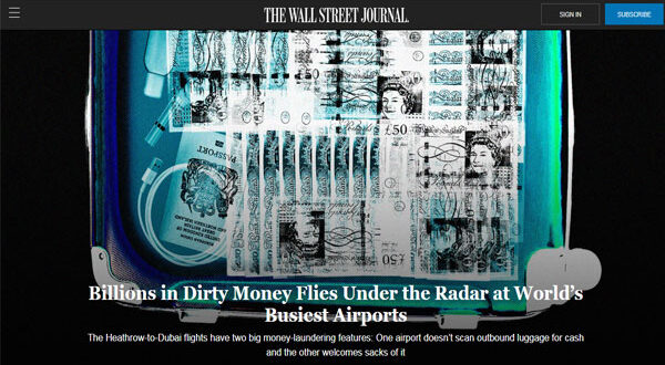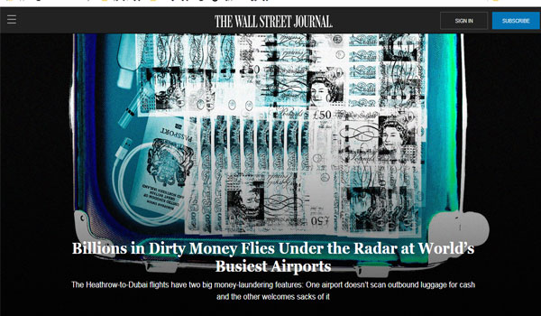 سلط تقرير حديث لصحيفة “وول ستريت جورنال The Wall Street Journal” الضوء على تحول الإمارات إلى مقصد الفاسدين وكبار اللصوص الأول لغسيل الأموال، وذكر أن رحلات هيثرو إلى دبي تحتوي على ميزتين كبيرتين لغسل الأموال: لا يقوم أحد في المطارات بتفتيش الأمتعة الصادرة بحثا عن النقود، والثانية يرحب بهذه الأموال داخل الدولة دون السؤال عن مصدرها.