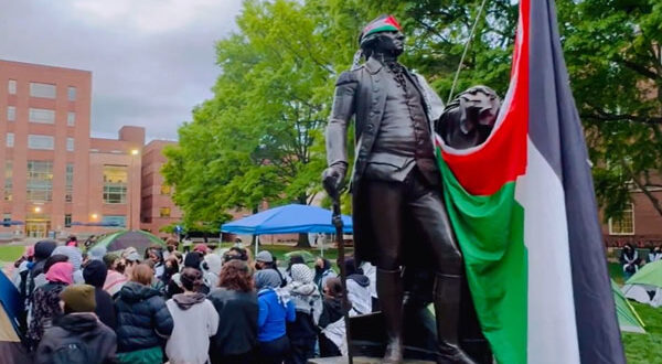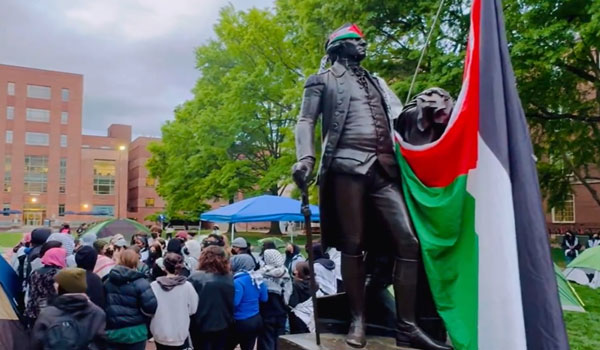 وأظهر مقطع فيديو رصدته “وطن” العشرات من الطلاب أمام مبنى الجامعة وقرب تمثال لجورج واشنطن، وقد حملوا أعلام فلسطين ورددوا شعارات مؤيدة لها ولقطاع غزة، الذي يتعرض لحرب وحشية من قبل الكيان الإسرائيلي، فيما ظهر تمثال جورج واشنطن معصوب العينين ويحمل علم فلسطين.
