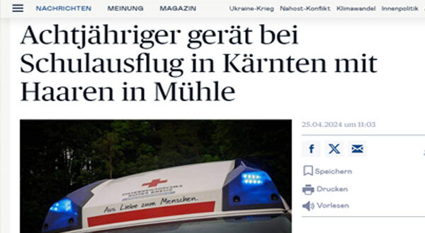 تعرض تلميذ في مدرسة ابتدائية لإصابات خطيرة في رأسه أثناء زيارة مطحنة قديمة، خلال رحلة مدرسية إلى مزرعة في كلاغنفورت بولاية كارينثيا، الأسبوع الماضي.