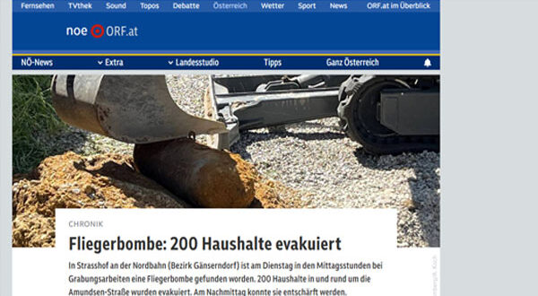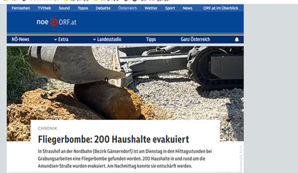 شهدت مدينة غينزندورف “Bezirk Gänserndorf” التابعة لولاية النمسا السفلى عملية إخلاء واسعة النطاق بعد ظهر اليوم الثلاثاء، إثر اكتشاف قنبلة جوية ألمانية تزن حوالي 50 كيلوجرامًا، أثناء أعمال التنقيب.