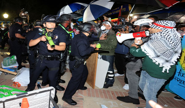 ضباط شرطة إنفاذ القانون يدخلون مخيم احتجاج مؤيد للفلسطينيين في جامعة كاليفورنيا في لوس أنجلوس في 2 مايو/آيار 2024-رويترز