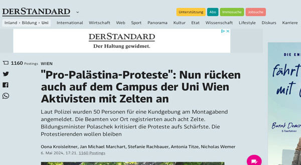 فقد افترش اليوم طلاب جامعة فيينا الساحات في الحرم الجامعي، منددين بدعم “إبادة المدنيين في غزة” وفق وصفهم.