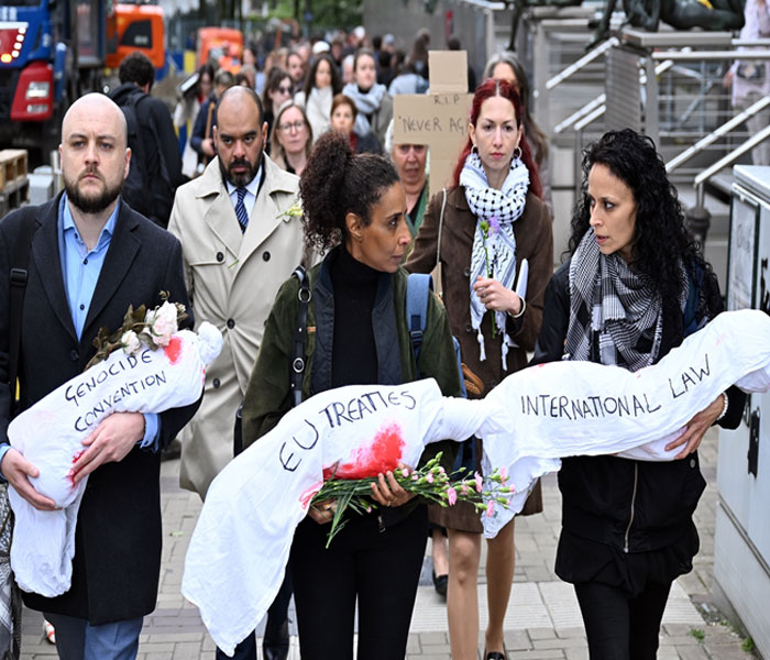 المتظاهرون من العاملين في مؤسسات الاتحاد الأوروبي، أقاموا “جنازة” رمزية، معتبرين أن “القانون الدولي ومعاهدات الاتحاد الأوروبي، واتفاقية الأمم المتحدة بشأن الإبادة الجماعية، قد ماتت”.