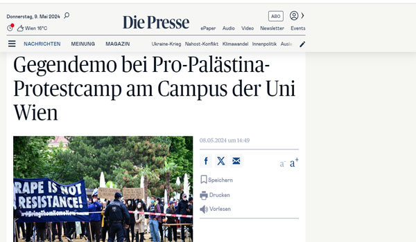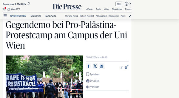 وكان طلاب جامعة “فيينا” قد نصبوا خيام الاعتصام في حرم الجامعة مذ 6 مايو الجاري، للمطالبة بوقف حرب الإبادة الجماعية ضد أهالي القطاع، ووقف جميع أشكال التعاون البحثي بين جامعات النمسا مع الجامعات “الإسرائيلية” ووقف تعاون مراكز البحوث النمساوية مع شركات سلاح تدعم الكيان “الإسرائيلي” وتشارك بالإبادة في فلسطين وسواها من المناطق الساخنة حول العالم.