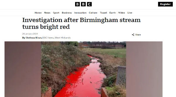 أطلق مجلس مدينة برمنغهام البريطانية تحقيقاً في حادثة غريبة تكشفت في مجرى نهر برمنغهام، رصدها أحد المارة يوم 25 يناير/كانون الثاني، حيث تلوّن النهر بأكمله باللون الأحمر القاتم وهو ما اعتبره البعض ظاهرة مرعبة كما وصفته صحيفة “ديلي ميل” بأنه علامة من علامات اقتراب موعد يوم القيامة.