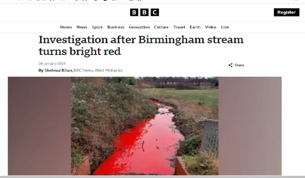 بعد إعلام السلطات البريطانية من قبل أحد المواطنين بحادثة مجرى النهر الملون بالأحمر الدموي في برمنغهام أطلق مجلس المدينة تحقيقاً في هذه الظاهرة غير العادية.