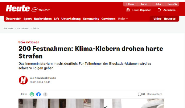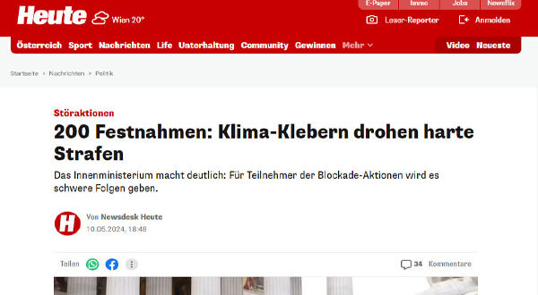 أعلنت وزارة الداخلية النمساوية، اعتقال 31 ناشطًا في مجال المناخ بتهمة التورط في “أعمال تخريبية”، مما يرفع عدد الاعتقالات بين نشطاء المناخ إلى 200 منذ بداية العام الحالي.