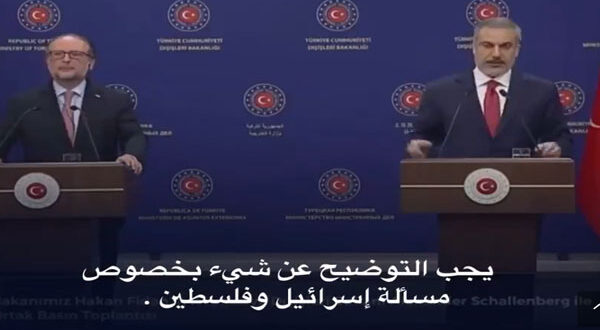 وقال “فيدان” خلال مؤتمر صحفي جمعه، الثلاثاء، مع المسؤول النمساوي في العاصمة أنقرة خلال زيارة الثاني لها إن اسرائيل هي قوة احتلال، وأضاف :”هذه الحرب لم تأتي من العدم هناك احتلال واضح.. هذا الاحتلال لم يتوقف وهو مستمر في سرقة أراضي الفلسطينيين من قبل لصوص يُسمون بـ”المستوطنين” .