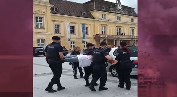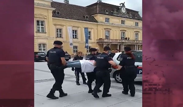 في السياق، قامت الشرطة النمساوية باعتقال أحد المتظاهرين وسط هتافات داعية للحرية لفلسطين.