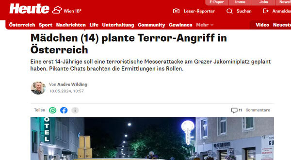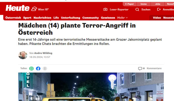 ألقت السلطات النمساوية القبض على فتاة تبلغ من العمر 14 عامًا، للاشتباه في تخطيطها لتنفيذ هجوم إرهابي، في ساحة ياكوميني بمدينة غراتس عاصمة ولاية شتايرمارك.