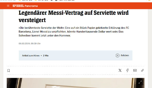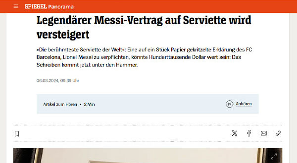 بيع منديل ورقي يحمل توقيع ليونيل ميسي، أسطورة كرة القدم الأرجنتينية، في مزاد علني نظمته دار “بونهامز” في لندن بمبلغ 762 ألف جنيه إسترليني (حوالي 890 ألف يورو).