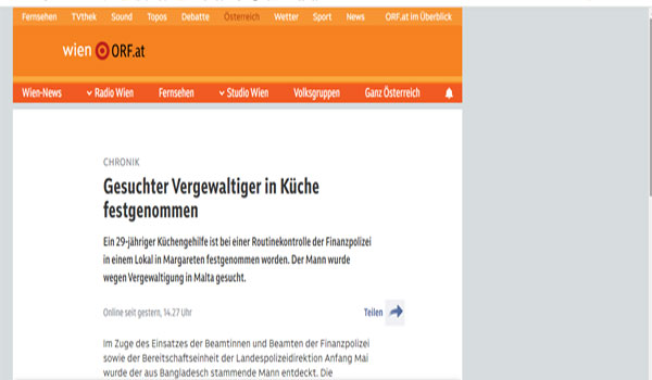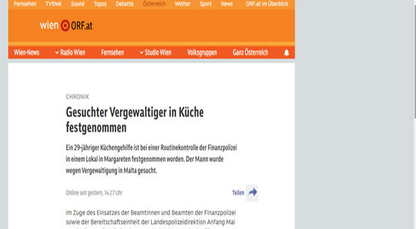تمكنت الشرطة المالية من إلقاء القبض على رجل مطلوب دوليًا بتهمة الاغتصاب، خلال عملية تفتيش روتينية لأحد المطاعم، في الحي الخامس “مارغريت” بمدينة فيينا.