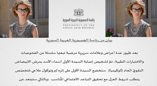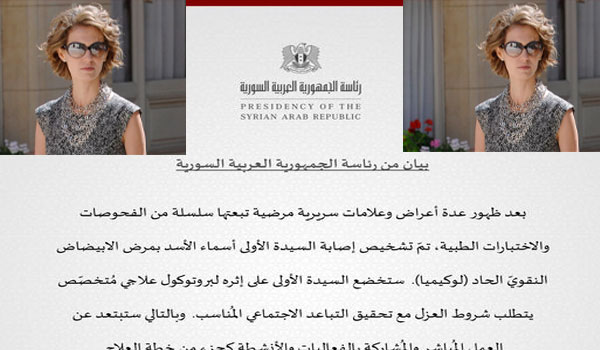 أعلنت رئاسة الجمهورية التابعة للنظام السوري، إصابة أسماء الأسد زوجة رئيس النظام بشار الأسد بسرطان الدم.