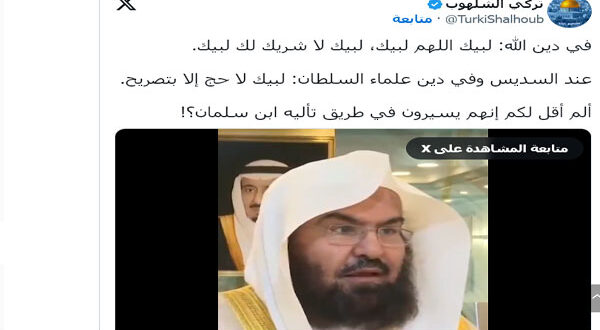 أثارت تصريحات لرئيس الشؤون الدينية في الحرمين الشريفين الشيخ عبد الرحمن السديس، جدلاً واسعاً على منصات التواصل الاجتماعي بخصوص تلبية الحج وربط دعوة “لبيك اللهم لبيك، لبيك لا شريك لك لبيك” بتصريح الحج.