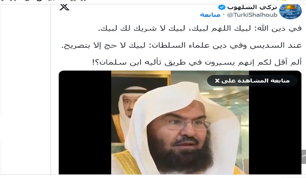 رد عليه على الفور: “لبيك لا حج إلا بتصريح.” والمخالفة-كما قال السديس – هي مخالفة لولي الأمر وحكم الإمام في الرعية منوط –حسب قوله- بالمصلحة الشرعية.