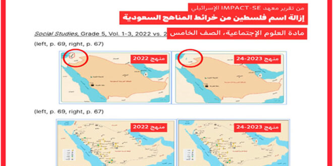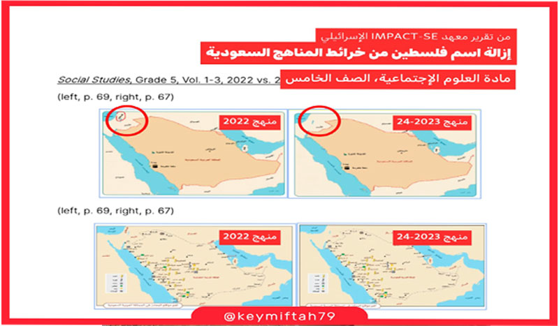 نشر معهد “IMPACT-se” الإسرائيلي تقريرًا خطيراً ومطولاً عن المناهج السعودية المعدلة بأوامر ولي العهد الأمير محمد بن سلمان، ومن بعض ما أظهره التقرير هو إزالة توصيف الصهيونية بأنها “حركة أوروبية عنصرية”، وحذف دولة “فلسطين” من العديد الخرائط التعليمية.