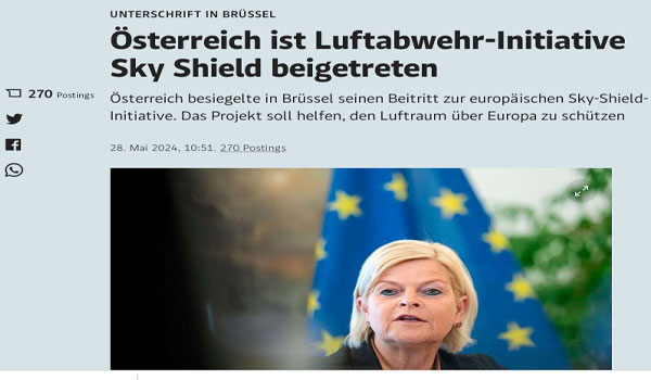 ووقعت كلاوديا تانر، وزيرة الدفاع النمساوية، اليوم مذكرة التفاهم الخاصة بانضمام النمسا إلى مظلة الدفاع الجوي المشتركة فى العاصمة بروكسل قائلة “خطوة اليوم مهمة للغاية لأمن النمساويين.. النمسا، باعتبارها دولة محايدة، لابد أن تحمى نفسها من التهديدات الجوية” .وأكدت أهمية حماية النمسا من التهديدات المتمثلة في الطائرات بدون طيار والصواريخ.
