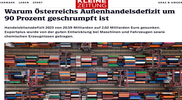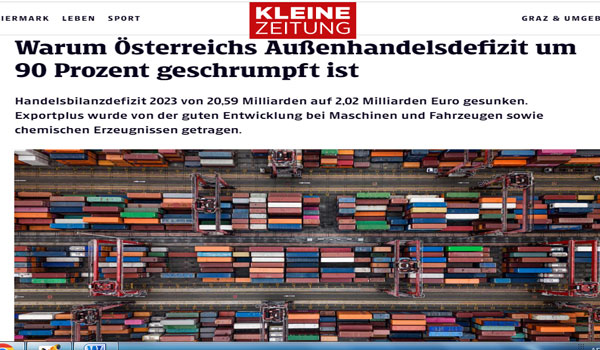 انخفض حجم العجز التجاري في النمسا بشكل حاد بلغ 90% إلى 2.02 مليار يورو فقط في العام الماضي 2023 مقارنة على أساس سنوي.