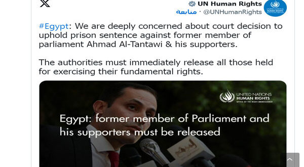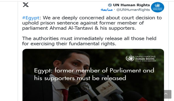 من جانبها، قالت المتحدثة باسم مفوضية الأمم المتحدة السامية لحقوق الإنسان مارتا هورتادو في بيان: “نشعر بقلق بالغ إزاء القرار الذي أصدرته محكمة استئناف القاهرة في 27 مايو/أيار الجاري، بتأييد حكم السجن لمدة عام مع الشغل ضد النائب السابق في البرلمان الذي كان يرغب في الترشح للرئاسة أحمد الطنطاوي و22 من أنصاره”.
