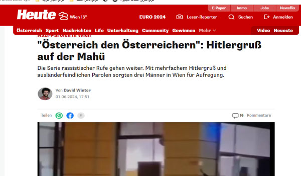 في واقعة أثارت القلق والاستنكار، قام ثلاثة رجال في فيينا بتأدية تحية هتلر بشكل متكرر وترديد شعارات عنصرية، وذلك في شارع مارياهيلفر ليلة الخميس الماضي.
