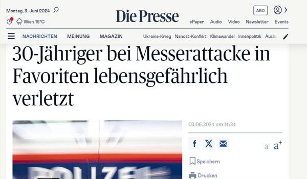 ويُزعم أن المشتبه به طعن الضحية بسكين في رقبته وساقيه وبطنه قبل أن يتمكن شهود عيان من التدخل لإنقاذه، وفر المشتبه به من مكان الحادث باتجاه شارع اينزيرسدورف.