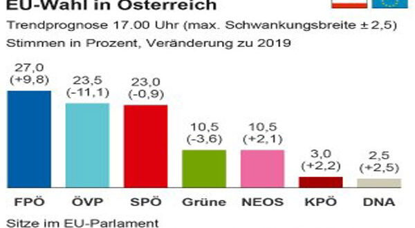 أظهرت المؤشرات الأولية لنتائج انتخابات برلمان الاتحاد الأوروبي التي جرت في النمسا اليوم /الأحد/ تفوقًا ساحقًا لحزب الحرية اليميني المتشدد.