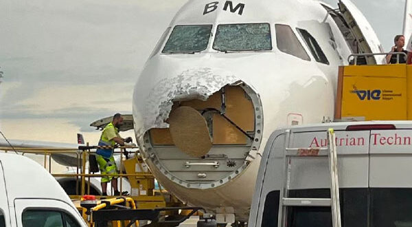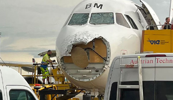ألحقت عاصفة من البَرَد أضراراً بالغة بطائرة ركاب أثناء اقترابها من مطار فيينا أمس (الأحد)، في الوقت الذي تضرب النمسا عواصف رعدية عنيفة مصحوبة بأمطار غزيرة خلفت فيضانات في مختلف أنحاء البلاد.