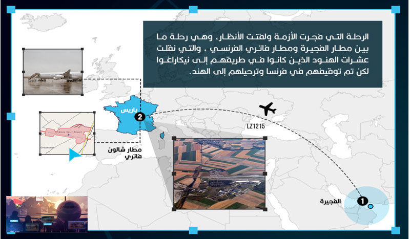 الرحلة التي فجرت الأزمة، والتي خرجت من مطار الفجيرة في الإمارات إلى نيكاراغوا مروراً بباريس ، لكن شرطة باريس تحفظت على الأشخاص الذين كانوا ينوون الهجرة إلى أمريكا عبر مطار ماناغوا في نيكاراغوا