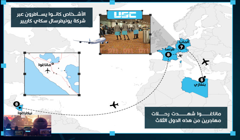 هذا المسار الجديد يقوم بنقل مئات المهاجرين غير الشرعين من دول مثل الهند وطاجكستان، وايران وكذلك مهاجرين غير شرعيين من جنسيات عربية، من مطار بنينا الليبي في بنغازي، إلى مطار أوغوستو سي ساندينو الدولي في ماناغوا، بنيكاراغوا، لكي يتحركوا بعدها إلى الولايات المتحدة الأمريكية وذلك عبر طيران غدامس الليبي الذي يتحكم فيه أحد رجال اللواء الليبي المتقاعد خليفة حفتر، وذلك وفق ما قالت مصادر عسكرية ليبية لـ” عربي بوست”.