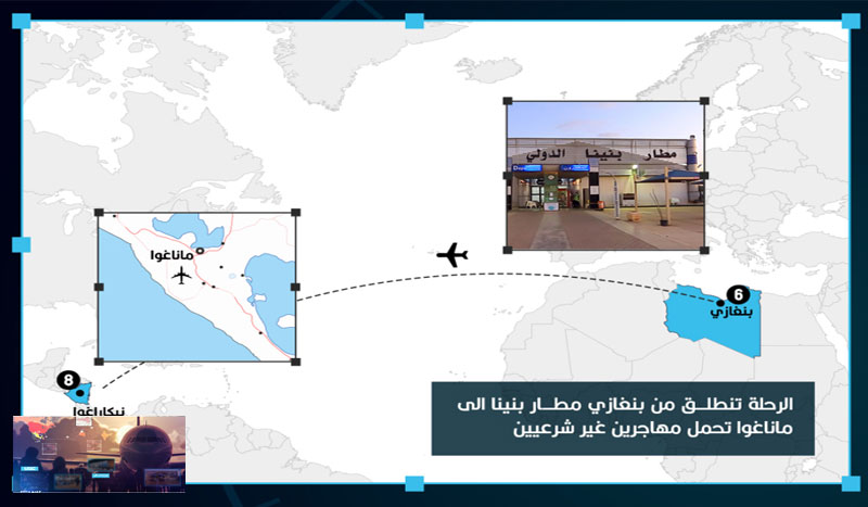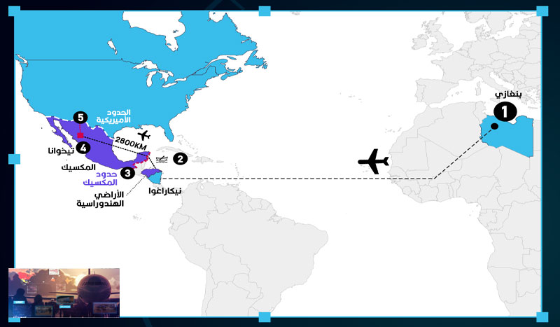 الرحلة تبدأ من بنغازي وتمر كل هذه المسافات الطويلة للوصول إلى نيكاراغوا، ثم بعد ذلك يمر المهاجرين بأراضي هندوراس ثم المكسيك للوصول إلى مدينة تيخوانا على الحدود مع أمريكا لدخول الأراضي الأمريكية