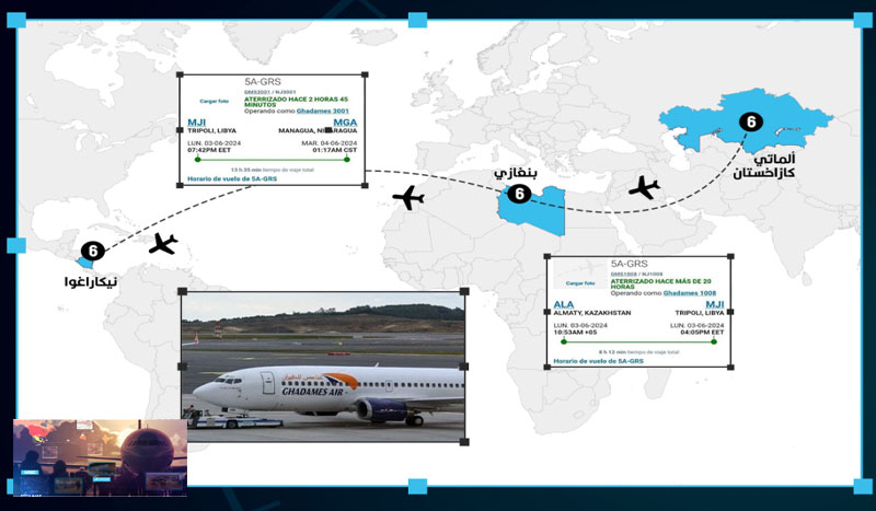 وقد وجدنا أن الطائرة التي تحمل التسجيل 5A-GRS، والتي توجهت أولاً لإحضار الركاب، إلى مطار ألماتي في كازاخستان، ثم توجهت بالركاب إلى ليبيا واستغرقت الرحلة 8 ساعات و12 دقيقة. وقد اكتشفنا أن الطائرة كانت تتزود بالوقود في ليبيا من أجل إكمال رحلتها إلى نيكاراغوا وقد أخفى مطار ماناغوا بيانات وصول الطائرة.