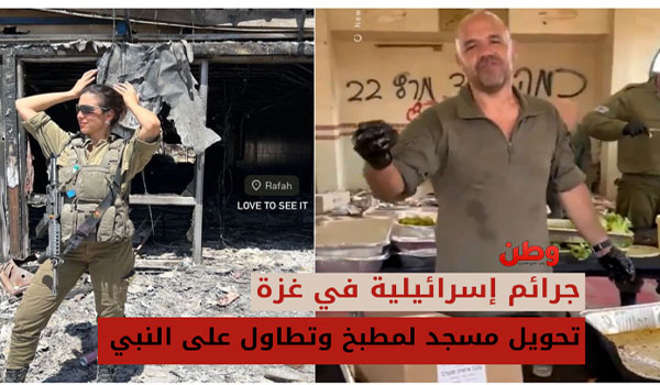 في استفزاز إسرائيلي جديد خلال الحرب المستمرة على غزة، أظهرت لقطات مصورة جنودًا إسرائيليين يحولون مسجدًا إلى مكان للطبخ. جرت الواقعة في الجانب الفلسطيني من معبر رفح الحدودي مع مصر، حيث أظهر الفيديو تقديم وجبات للجنود بعد تحويل المسجد إلى مطبخ. وبينت المشاهد طاولات كبيرة داخل المسجد عليها أصناف مختلفة من الأغذية.