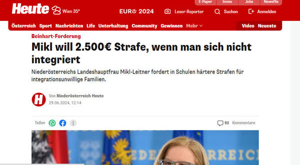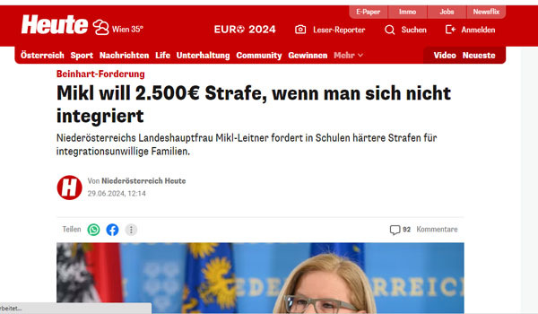 دعت حاكمة مقاطعة النمسا السفلى، يوحنا ميكل لايتنر، أنها تريد فرض قوانين أكثر صرامة على منح الجنسية النمساوية ومعاداة السامية وغرامات مالية على العائلات التي “ترفض الاندماج.”