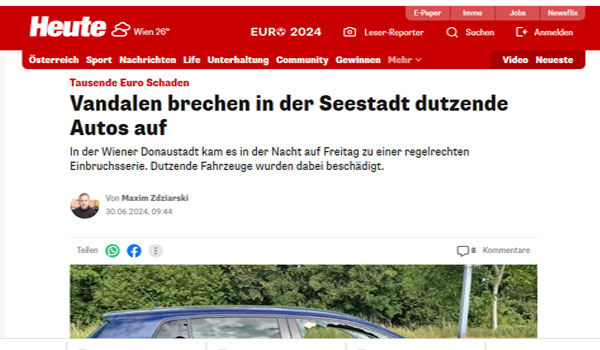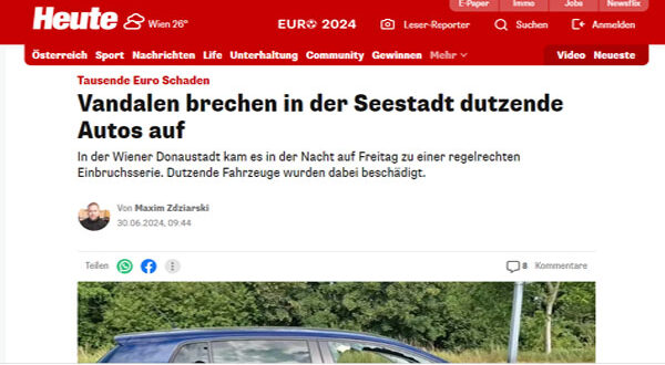 في صباح يوم الجمعة، اكتشف سكان شارع يوهان-كوتشيرا  ” Johann-Kutschera-Gasse” في منطقة دوناوشتات، يخرجون من المنزل في فترة الصباح، ليتفاجؤون بقيام لصوص بتهشيم زجاج السيارات وقد اقتحموا عشرات السيارات خلال الليل وسرقة جميع محتوياتها من الداخل دون أن يشعر بهم أحد من سكان الحي، حيث أن هذه ظاهرة أصبحت منتشرة في الكثير من أحياء فيينا، فيما ناشد سكان الحى بمتابعة الجهات الأمنية للحادث والبحث عن هؤلاء اللصوص وتسليمهم للعدالة