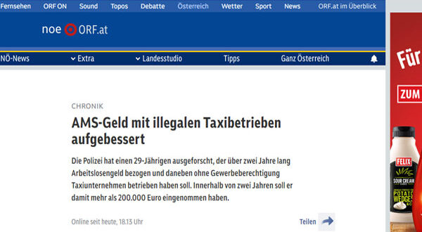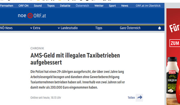 جاء ذلك بعد تحقيقات الشرطة في ولاية النمسا السفلى، اليوم الأربعاء، عن قيام رجل صربى بإدارة شركة سيارات أجرة غير مرخصة وفى نفس الوقت حصوله على إعانة البطالة بشكل غير قانوني لمدة عامين