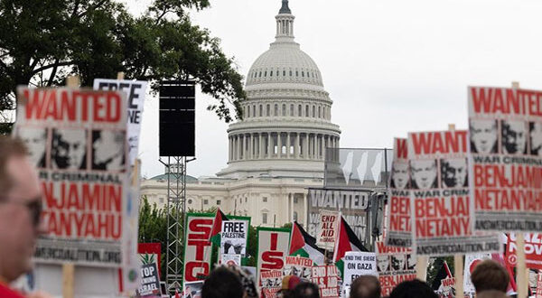 ملأ آلاف المؤيدين لفلسطين، شوارع العاصمة الأمريكية واشنطن، للاحتجاج ضد رئيس الوزراء الإسرائيلي بنيامين نتنياهو، الذي يتواجد في الولايات المتحدة الأمريكية ويستعد لإلقاء خطاب في الكونغرس، مساء الأربعاء.