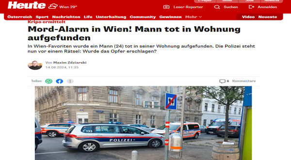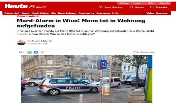 عثرت شرطة العاصمة النمساوية فيينا، مساء أمس الجمعة الموافق 16 من أغسطس، على جثة شاب يبلغ من العمر 28 عامًا داخل مسكنه بالحى التاسع عشر – فيينا، بعد تلقي بلاغ من الجيران الذين لاحظوا آثار دماء على سلم المنزل المؤدي إلى سكنه