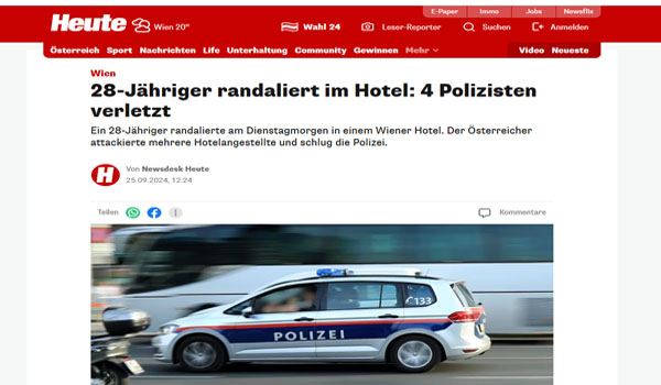 شهد أحد فنادق العاصمة النمساوية فيينا بشارع الجيرتل حادثة شغب، صباح يوم الثلاثاء، حيث قام لاعب كمال أجسام نمساوي من أصول تركية، يبلغ من العمر 28 عامًا، بمهاجمة موظفي الفندق وضباط الشرطة.